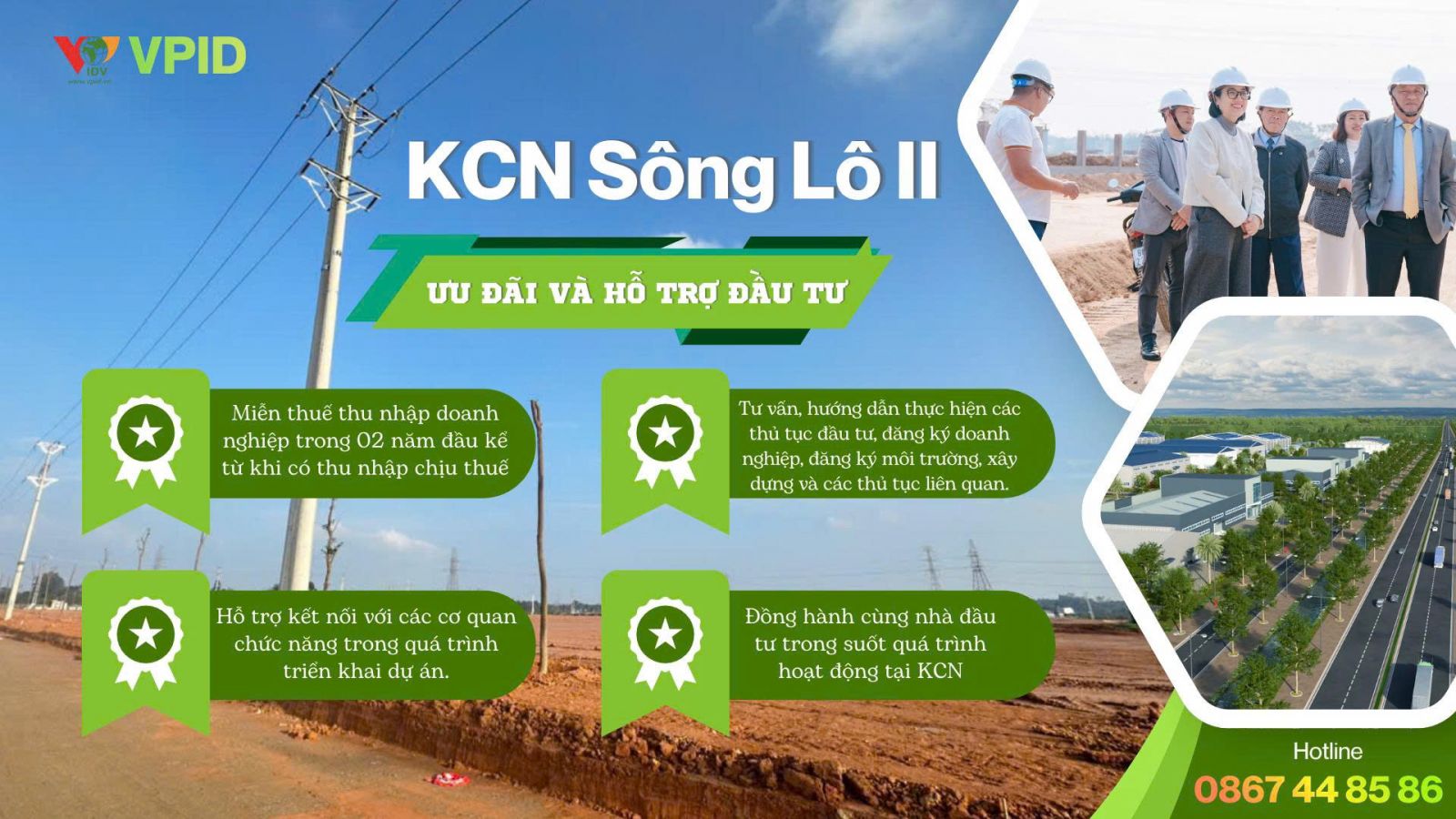 KCN SÔNG LÔ II – SẴN SÀNG ĐỒNG HÀNH, KIẾN TẠO GIÁ TRỊ CÙNG NHÀ ĐẦU TƯ Khu công nghiệp Sông Lô II có tổng diện tích 165,65 ha, là dự án khu công nghiệp trọng điểm tại vùng lõi phát triển công nghiệp phía Bắc, được đầu tư và phát triển bởi Công ty Cổ phần Phát triển hạ tầng Vĩnh Phúc – đơn vị có hơn 22 năm kinh nghiệm trong lĩnh vực đầu tư, xây dựng và vận hành hạ tầng khu công nghiệp tại Việt Nam. Với uy tín và kinh nghiệm đã được khẳng định qua việc phát triển thành công và lấp đầy 02 khu công nghiệp quy mô lớn, thu hút cộng đồng doanh nghiệp trong và ngoài nước hoạt động hiệu quả, Công ty Cổ phần Phát triển hạ tầng Vĩnh Phúc tiếp tục giới thiệu KCN Sông Lô II – dự án chiến lược thứ ba trong hệ thống khu công nghiệp do doanh nghiệp đầu tư và phát triển. Trụ Sở Khu Công Nghiệp Sông Lô II - sẵn sàng tiếp đón các Nhà đầu tư thuê đất. Vị trí địa lý vô cùng thuận lợi: KCN Sông Lô II cách nút giao IC6 cao tốc Nội Bài – Lào Cai chỉ 5.5 km, cách trung tâm tỉnh Phú Thọ 8 km và cách Sân bay Quốc tế Nội Bài khoảng 50 km. Với lợi thế giao thông liên kết vùng nhanh chóng, đây là vị trí lý tưởng để các nhà đầu tư tối ưu logistics và mở rộng thị trường. Với hệ thống quản lý chuyên nghiệp, nền tảng pháp lý hoàn chỉnh và quy hoạch đồng bộ, KCN Sông Lô II sẵn sàng đáp ứng linh hoạt nhu cầu thuê đất của các nhà đầu tư thuộc nhiều lĩnh vực sản xuất, đặc biệt là công nghiệp sạch, công nghệ cao và công nghiệp hỗ trợ. Nguồn điện được cung cấp liên tục và ổn định từ trạm biến áp 110/35/22 kV, bảo đảm năng lực cấp điện an toàn cho hoạt động sản xuất quy mô lớn. Hệ thống cấp nước sạch có công suất 50.000 m³/ngày đêm, đáp ứng đầy đủ nhu cầu sử dụng của toàn bộ doanh nghiệp trong khu công nghiệp. Hạ tầng viễn thông được đầu tư đồng bộ theo tiêu chuẩn quốc tế, sẵn sàng cung cấp mật độ 24–48 lines/ha, bảo đảm kết nối thông suốt và ổn định cho hoạt động sản xuất – kinh doanh. CÁC NGÀNH NGHỀ ƯU TIÊN THU HÚT ĐẦU TƯ INDUSTRIES PRIORITIZED FOR INVESTMENT Công nghiệp cơ khí Mechanical & Engineering Industry Công nghiệp điện tử Electronics Manufacturing Công nghiệp thiết bị điện Electrical Equipment Manufacturing Hóa dược – Hóa chất Pharmaceuticals & Chemicals Công nghiệp nhẹ Light Industry Vật liệu xây dựng Building Materials Industry ƯU ĐÃI VÀ HỖ TRỢ ĐẦU TƯ INVESTMENT INCENTIVES AND SUPPORT - Ưu đãi thuế thu nhập doanh nghiệp (TNDN) Miễn thuế thu nhập doanh nghiệp trong 02 năm đầu kể từ khi có thu nhập chịu thuế. Giảm 50% số thuế phải nộp trong 04 năm tiếp theo, theo quy định hiện hành áp dụng đối với dự án đầu tư mới tại địa bàn ưu đãi. - Ưu đãi tiền thuê đất: Miễn tiền thuê đất lên đến 11 năm (kể từ khi được giao đất). - Hỗ trợ pháp lý và thủ tục đầu tư Tư vấn, hướng dẫn thực hiện các thủ tục đầu tư, đăng ký doanh nghiệp, đăng ký môi trường, xây dựng và các thủ tục liên quan. Hỗ trợ kết nối với các cơ quan chức năng trong quá trình triển khai dự án. Đồng hành cùng nhà đầu tư trong suốt quá trình hoạt động tại KCN THÔNG TIN LIÊN HỆ Khu công nghiệp Sông Lô II 📍 Địa chỉ: Xã Sông Lô, Tỉnh Phú Thọ, Việt Nam 📞 Hotline: 0867 448 586 🌐 Website: www.vpid.vn